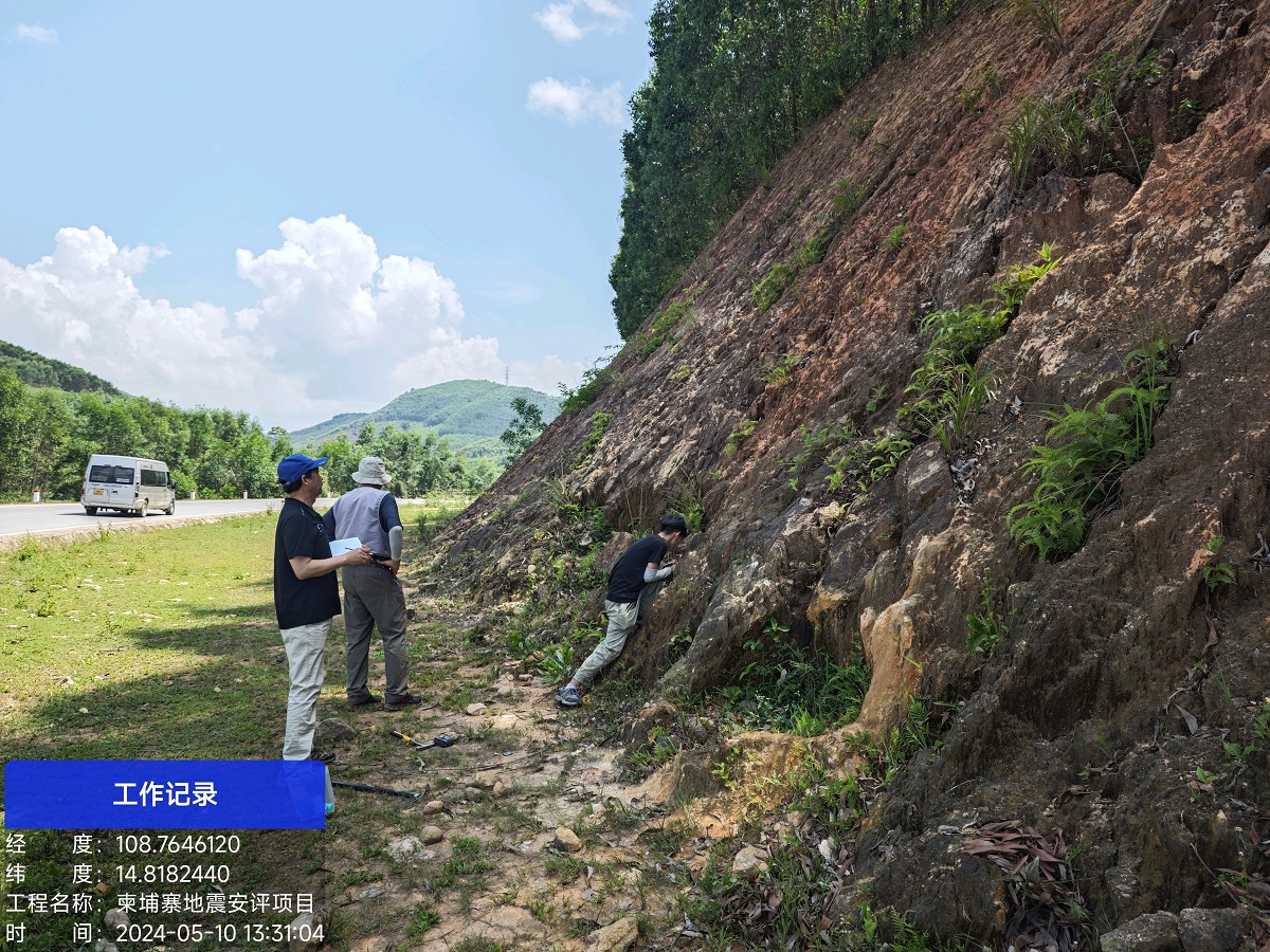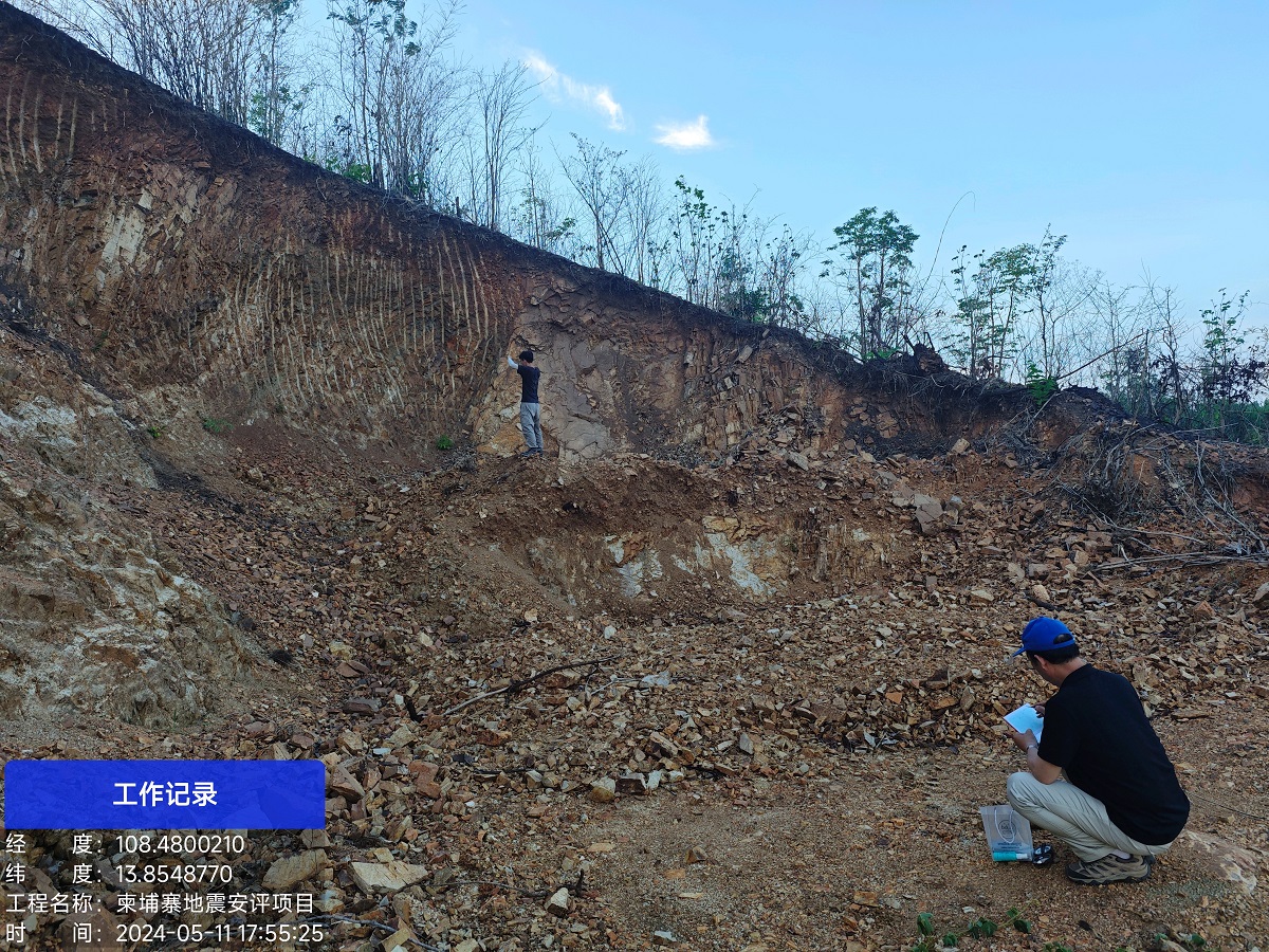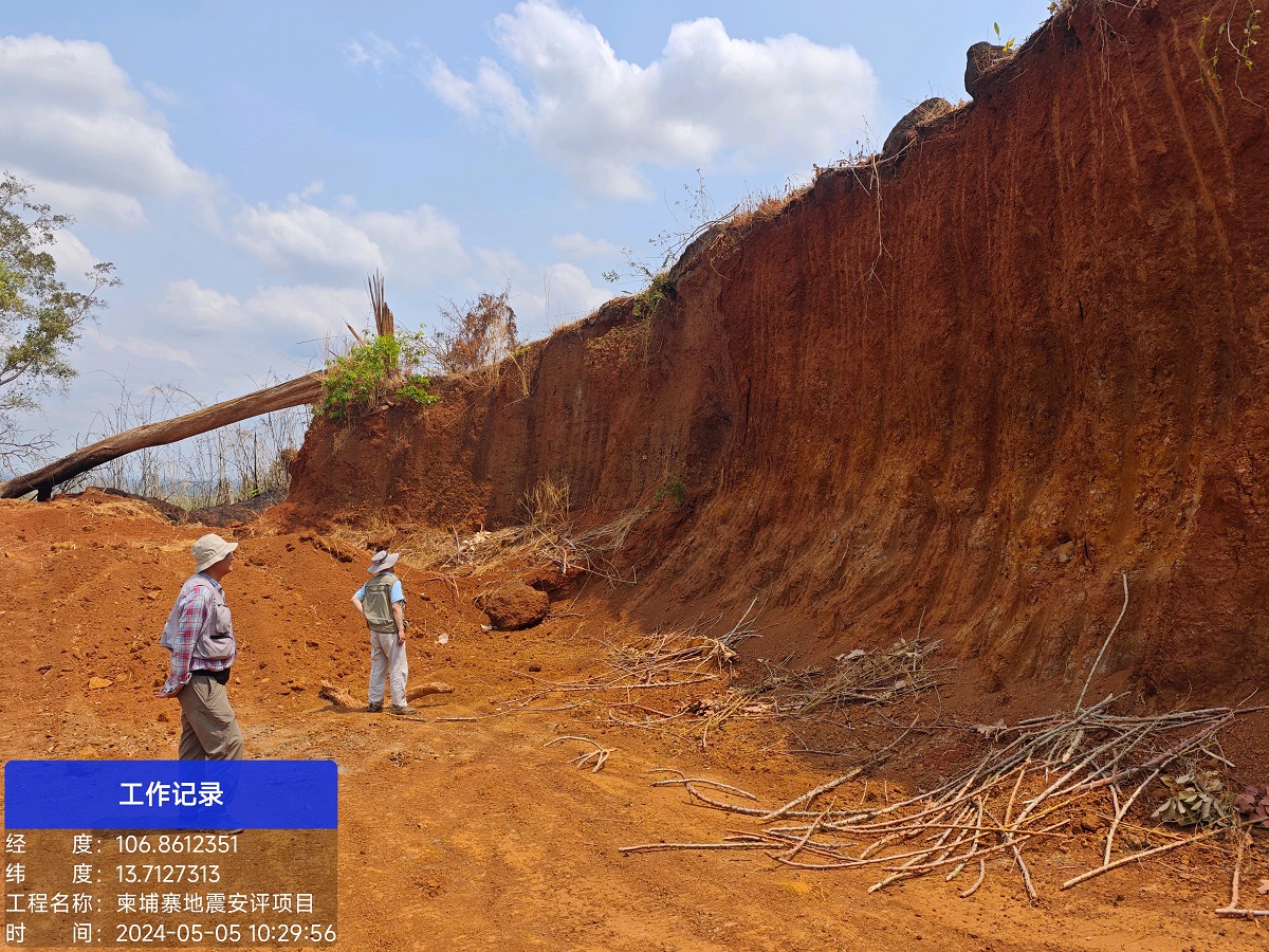 本次地震安评项目的工程场地位于柬埔寨的腊塔纳基里省境内,项目研究区域涵盖了柬埔寨和越南两国境内,两地地理环境复杂多变,给本次实地 勘察工作带来不小的挑战。本次前往柬埔寨东北部和越南中部对主要断层进行野外调查工作,并详细记录了文字描述和地质剖面图,包括地貌信息、地层产状和断层产状等内容。目前,该地震安评项目的前期踏勘工作已顺利完成,已进入项目报告编写、制图等阶段,预计6月底项目将进入评审收尾工作。